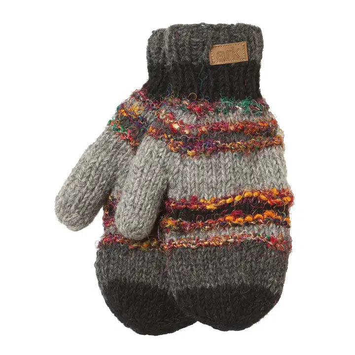 Ark Fair Trade's Swool Stripe Mittens are certified Fair Trade by the Fair Trade Federation and made with a mix of 100% New Zealand wool exterior and recycled silk, that has been lined with polyester fleece responsibly and ethically in Nepal, and made with love.